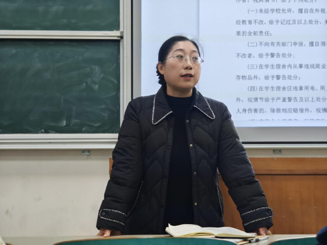 石红芳向班干部详解消防安全、用电安全、防诈骗、出行安全等校园常见安全问题并给出应对措施,要求班干部履职尽责,做好安全宣传与隐患排查,全力守护同学生命财产安全。她还针对近期班级管理问题提出要求。